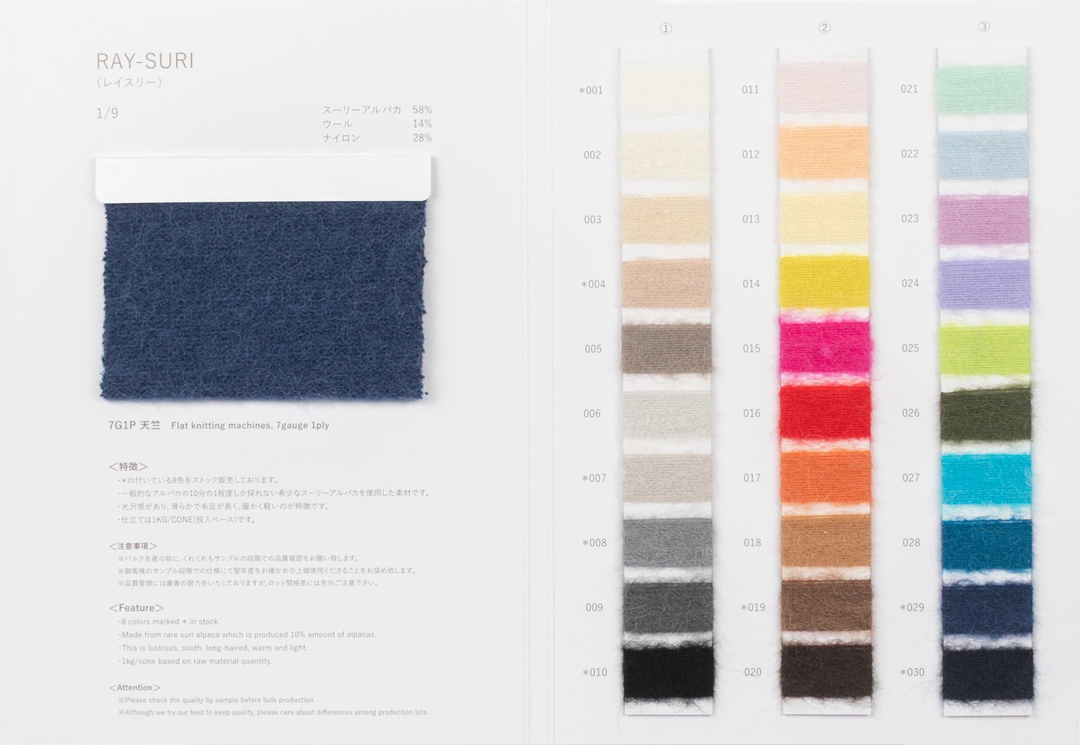 ・*印の付いている8色をストック販売しております。 ・一般的なアルパカの約10分の1の量しか採取できないとされる、希少なスーリーアルパカを使用した素材です。 ・光沢があり、滑らかで長い毛足を持ち、暖かく軽やかな特性があります。 ・イージーケア可能な素材です。 ・仕立ては1KG/CONE(投入ベース)です。 |